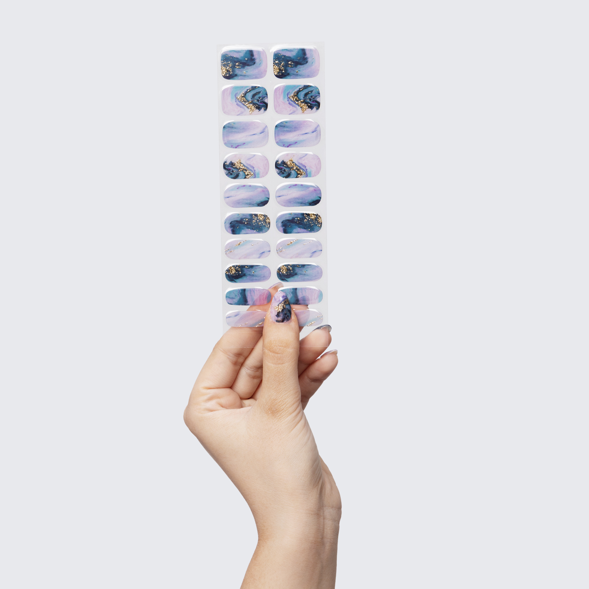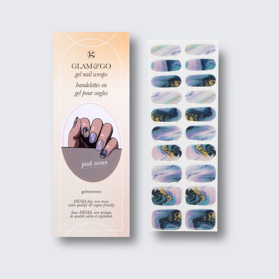 Our GLAM & GO gel nail wraps ensure that no matter how complex your chosen nail design, the application process remains incredibly simple. Our GLAM & GO gel nail wraps require no glue, base coat, or top coat—just peel them off the packaging, apply them to your nail, trim to size, cure twice, and voilà!