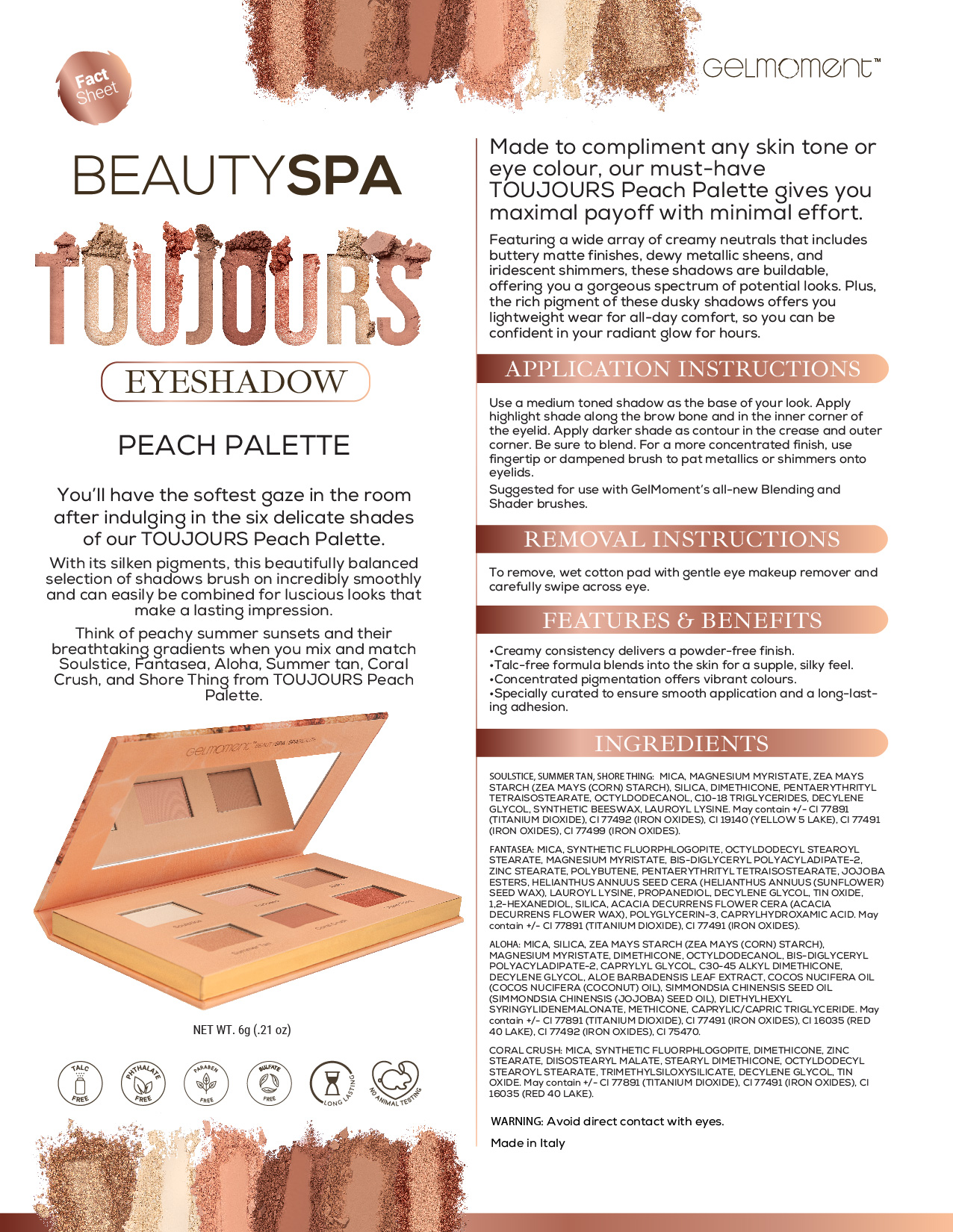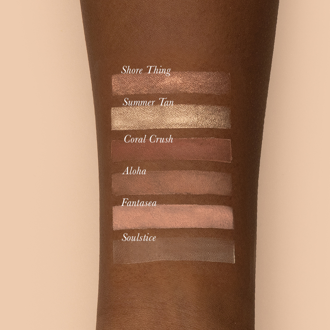 Have the softest gaze in the room with the delicate shades of TOUJOURS Peach Palette: Soulstice, Fantasea, Aloha, Summer Tan, Coral Crush, and Shore Thing.